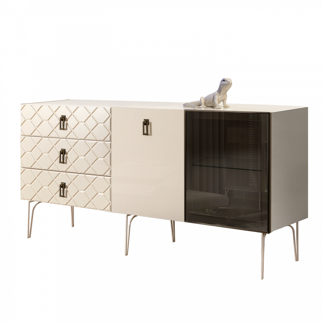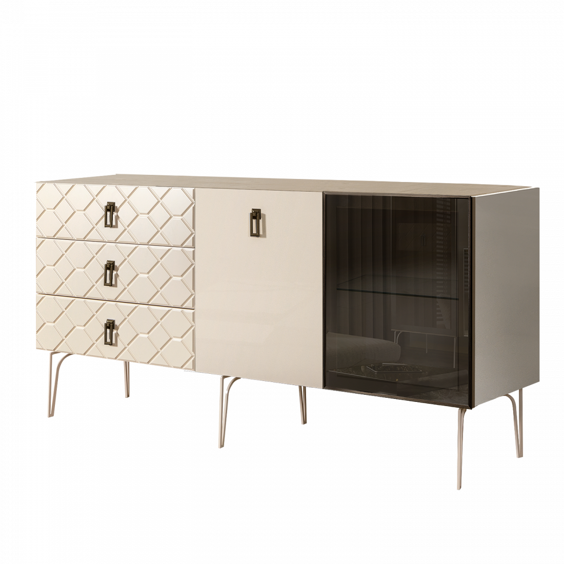 Стекло Stopsol меняет свои отражающие свойства под воздействием источников света. Поверхность, отражающая свет, мягко скроет содержимое вашего комода или витрины.