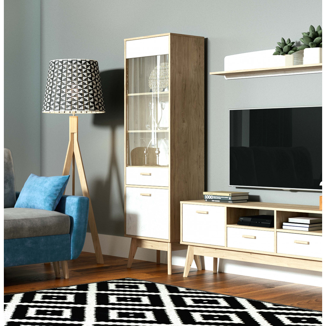 Ультратрендовый шкаф-витрина Калгари от Мебельград, выполненный в светлых тонах с элементами сдержанного стиля 60-х - высокие ножки, выраженная деревянная текстура натурального дуба, четкие формы. Вся мебель очень мобильная, компактная, вызывает чуство легкости и свободного пространства, при этом она функциональна.