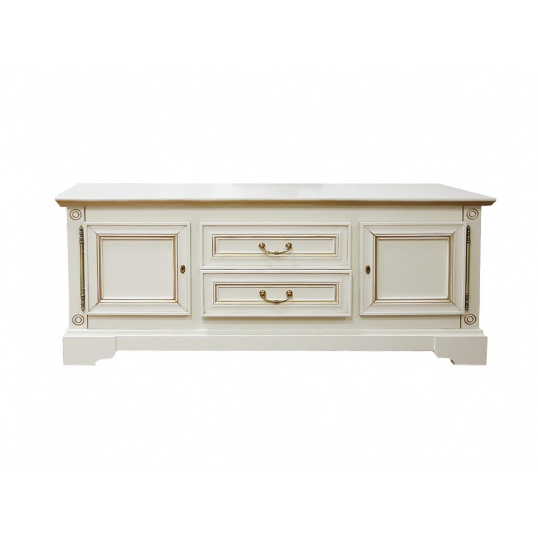 Элегантная классика дизайна и современные тенденции функциональности – тумба под телевизор «Полонез» ММ-174-16. Модель выполнена из массива и шпона бука в цвете белая эмаль с золотой патиной. Тумба имеет свои специфические свойства: штыревые наружные петли; стильную итальянскую фурнитуру; декорирование изящными резными элементами; два выдвижных ящика по центру; два боковых отделения, которые закрываются на ключ.