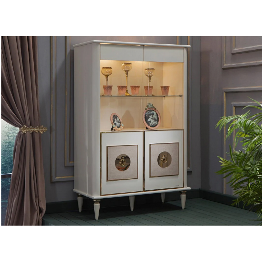Роскошная витрина Мистраль на высоких ножках с золочением, с декоративной отделкой дверей станет центром притяжения вашей гостиной или столовой. Золотая отделка по периметру двери и декоративной вставки, центральный золотой элемент круглой формы, круглая ручка- все это добавит роскоши такому предмету